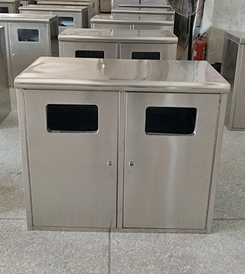 簡潔雙分類不銹鋼垃圾箱核心部件模壓成型不脫焊不易破損堅固耐用。全桶身不銹鋼制作的垃圾箱還具有防火功能,金屬亮澤,高雅美觀,應用范圍廣;內外表面光潔,減少垃圾殘留,易于清潔;可根據客戶需求選配鍍鋅內桶或玻璃鋼內桶。