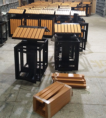 產(chǎn)品材質(zhì):欣方圳仿屋形分類鋼木垃圾桶采用現(xiàn)代化批量制作工藝