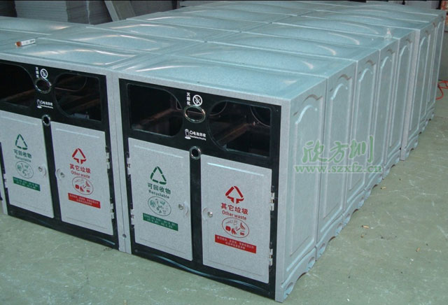 ? 欣方圳產品型號為A113玻璃鋼仿大理石垃圾桶的產品規格為:850*370*940mm,這批由我公司專門為海洋性氣候設置的垃圾桶,其材質為:蓋、側板、門均采用(Bmc)高分子復合團狀模塑料高溫模壓成型。前板、后板、投放口、底板、內桶均采用(SMC)高分子復合片狀模塑料高溫模壓成型,造型美觀;具有抗腐蝕、抗酸堿,防潮,抗紫外線在自然條件下能耐高低溫,沒有回收盜用價值,非常適合在沿海城市里投入使用。