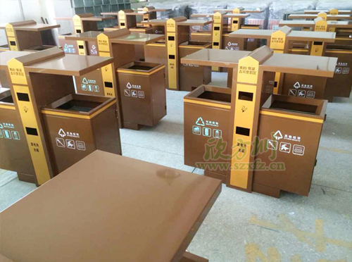 ?? F238戶外分類垃圾桶,外桶為足1.2mm鍍鋅板,表面噴塑工藝,內膽為201#,厚足0.75mm, 螺絲螺母為304不銹鋼材質,采用不銹鋼膨脹螺?? 安裝。噴塑顏色為土豪金色,垃圾桶開口位置坐折邊處理,箱體帶簡易防盜鎖。左右兩邊分別絲印,可回收物,其他垃圾等圖案標志。中間橙黃色區域,印有美的·鷺湖森林度假區,廢電池光碟字樣,字體顏色為土豪金色。欣方圳工程師采用金色的獨特性的設計風格,特別受到物業,房地產,機場,小區等單位的青睞。