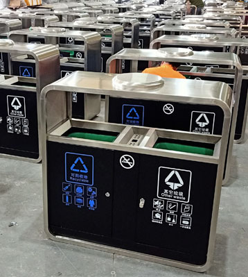 產品材質:物業小區雙分類鋼制垃圾箱采用現代化批量制作工藝,選用優質冷軋鋼板,核心部件模壓成型不脫焊不易破損堅固耐用。表面經過除油、噴砂防銹處理后,再進行酸洗磷化處理,鋼制桶表面清理后整體進行靜電噴涂或烤漆處理,靜電噴涂是經過流水線高溫固化爐固化后再出爐冷卻,漆面色澤耐久,防腐防銹。