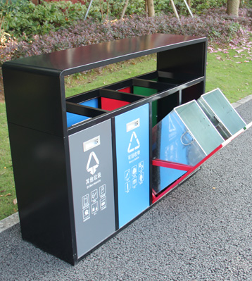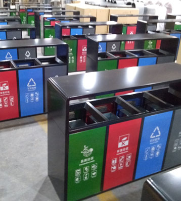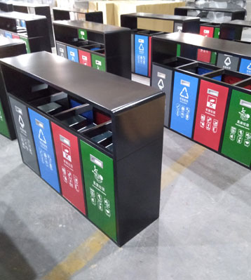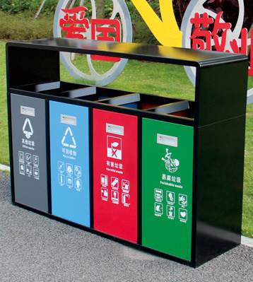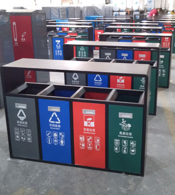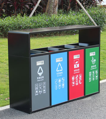 產品材質:戶外四分類垃圾果皮箱采用現代化批量制作工藝,選用優質冷軋鋼板,核心部件模壓成型不脫焊不易破損堅固耐用。表面經過除油、噴砂防銹處理后,再進行酸洗磷化處理,鋼制桶表面清理后整體進行靜電噴涂或烤漆處理,靜電噴涂是經過流水線高溫固化爐固化后再出爐冷卻,漆面色澤耐久,防腐防銹。