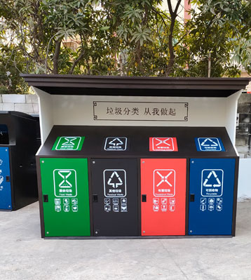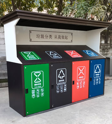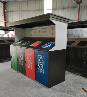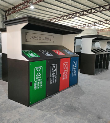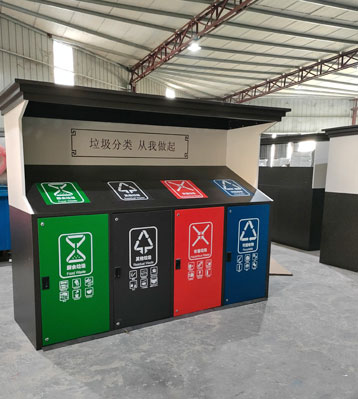 產品材質:大容量垃圾箱組合屋垃圾分類房(根據地方垃圾分類標準,由有害垃圾箱、可回收物、其他垃圾、廚余垃圾箱四種常見的垃圾分類容器),工廠擁有大功率激光切割機,大型數控折彎機等現代化批量制作工藝,可選用足厚201#/304#不銹鋼或鍍鋅板材料加工制作,核心部件模壓成型不脫焊不易破損堅固耐用。表面經過除油、噴砂防銹處理后,再進行酸洗磷化處理,金屬垃圾箱表面清理后整體進行靜電噴涂或烤漆處理,門板分色烤漆垃圾投放醒目戶外防腐防銹更耐用。門板帶三角鎖保障內筒耐用性,配240升塑料內桶防污水外漏,投口液壓桿緩沖復位密閉無異味散發更環保。