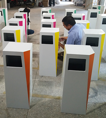 產品材質:鋼制垃圾桶采用現(xiàn)代化批量制作工藝,選用優(yōu)質冷軋鋼板,核心部件模壓成型不脫焊不易破損堅固耐用。表面經過除油、噴砂防銹處理后,再進行酸洗磷化處理,鋼制桶表面清理后整體進行靜電噴涂或烤漆處理,靜電噴涂是經過流水線高溫固化爐固化后再出爐冷卻,漆面色澤耐久,防腐防銹。