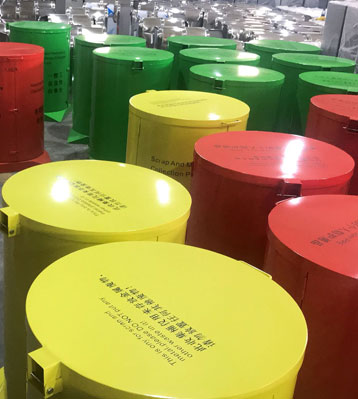 產品材質:危廢垃圾箱采用現代化批量制作工藝,選用優質冷軋鋼板,核心部件模壓成型不脫焊不易破損堅固耐用。表面經過除油、噴砂防銹處理后,再進行酸洗磷化處理,鋼制桶表面清理后整體進行靜電噴涂或烤漆處理,靜電噴涂是經過流水線高溫固化爐固化后再出爐冷卻,漆面色澤耐久,防腐防銹。