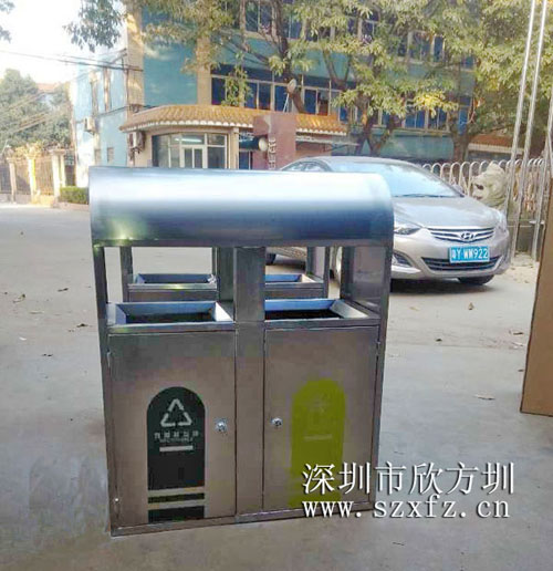??? 按照客戶的定制要求不銹鋼垃圾桶規格為800*350*1000mm,材質采用1.0mm厚的優質304#不銹鋼模壓成型,配用0.4mm厚的鍍鋅板內膽,桶身表面防銹、內里防腐,最大程度的延長了該款垃圾桶的使用壽命!在款式方面,C219不銹鋼垃圾桶表面打磨的光滑明亮,投口邊緣處理到位,不割手,桶身貼有藍綠兩色來表示兩分類的標識,即藍色的可回收和綠色的不可回收,清晰明了。