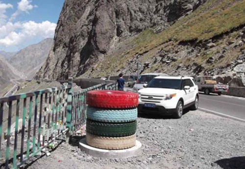 新疆公路新景點 廢舊輪胎變身“彩色垃圾箱”