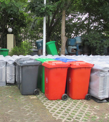 桶體與桶蓋分別使用模具一次注模而成整體性能好,絕無焊縫;其本身就是可循環利用的環保產品,比起其他類型的垃圾桶產品塑料垃圾桶的生產時間比較短(一般在5分鐘左右就可以生產出一個塑料垃圾桶)。往往塑料垃圾桶設計時桶身都可以套疊,對產品的物流運輸及倉儲都減少很大的體積。